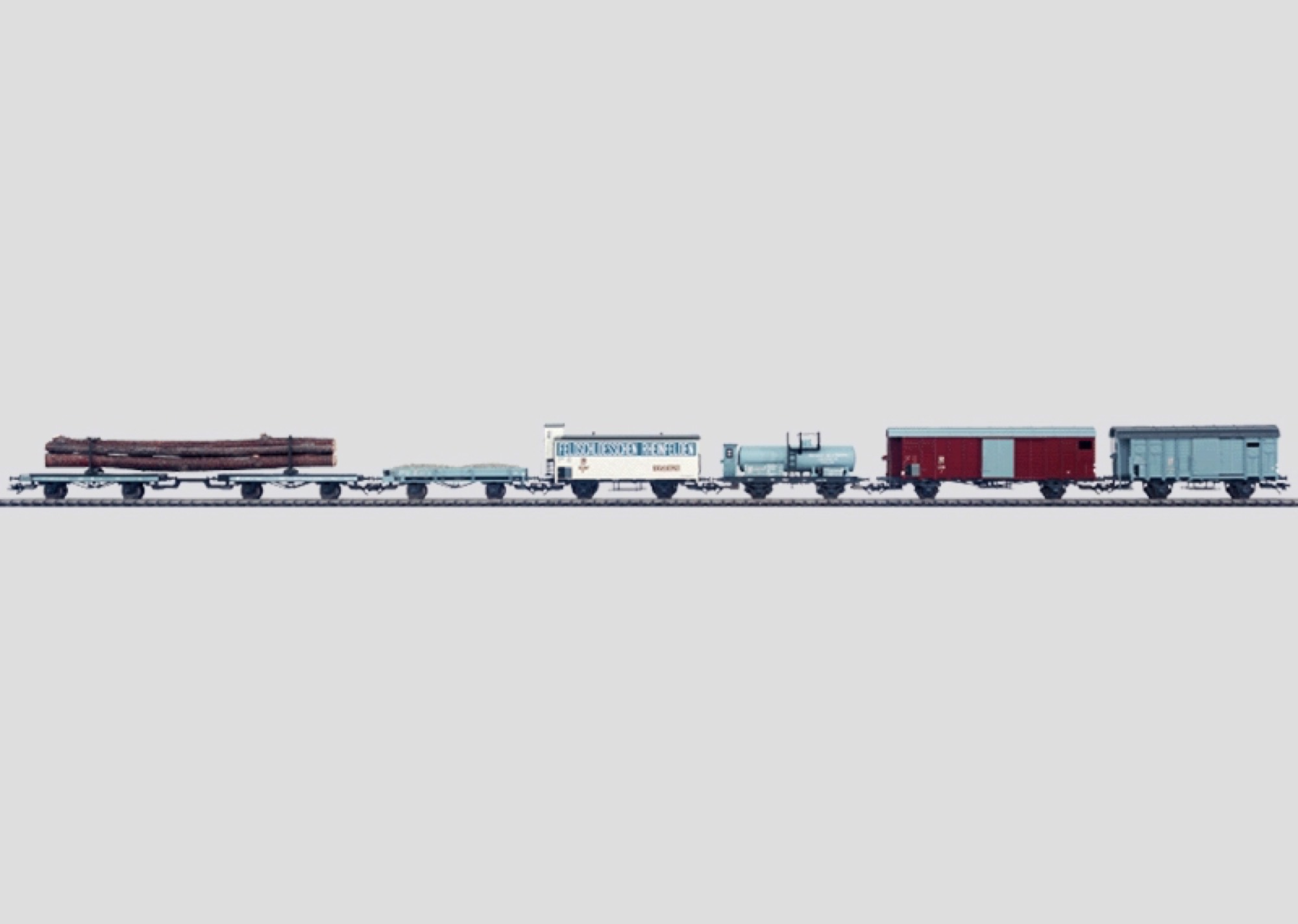 Modell: Gedeckte Güterwagen mit Bremserhaus und Schiebetüren zum Öffnen. Zisternenwagen mit Bremserhaus. Nachbildung des durchbrochenen Wagenbodens. Bier-Kühlwagen mit Bremserhaus und kurzem Trittbrett. Niederbordwagen mit echtem Schotter in maßstäblicher Körnung beladen. Drehschemel-Wagenpaar mit fester Verbindungsdeichsel. Mit echtem Stammholz beladen, durch feine Metallkette gesichert. Gesamtlänge über Puffer 83,1 cm.