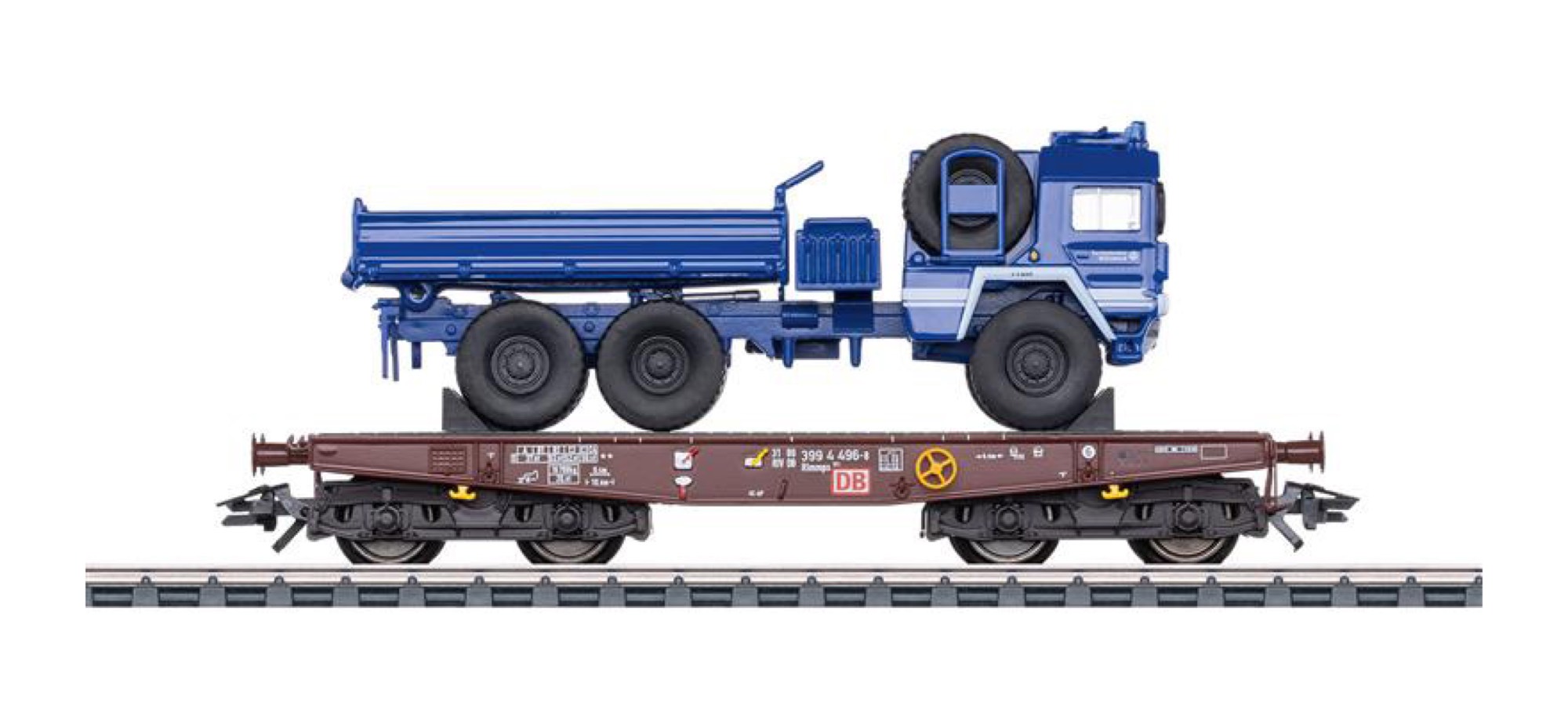 >Vorbild: 4-achsiger Schwerlastwagen Bauart Rlmmps 651 der Deutschen Bahn AG (DB AG). Beladen mit einem MAN 3-Achser THW Kipper.