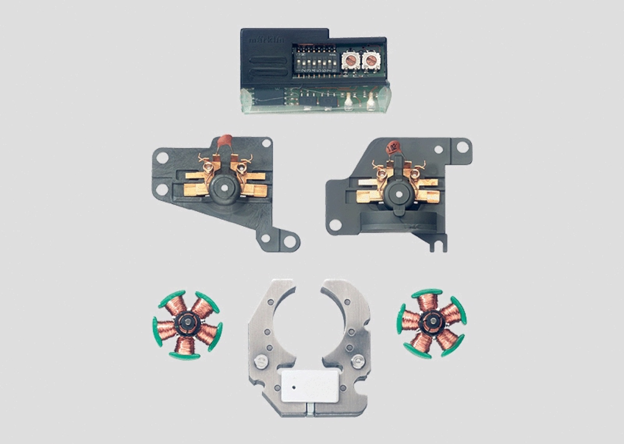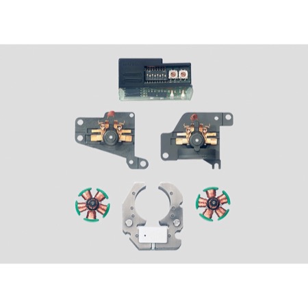 Features: Consists of a locomotive decoder, a five-pole, high-efficiency motor and installation hardware for converting certain older Märklin H0 locomotives with the flat commutator motor to digital high-efficiency propulsion. The electronic circuit in this kit has 4 controllable functions (headlights from "function", smoke generator and Telex couplers, for example, from "f1" and "f2", minimal setting for the acceleration and braking delay from "f4"). The Control Unit (no. 6021) must be used as the central unit to control functions "f1", "f2" and "f4". Adjustable maximum speed. Adjustable acceleration and braking delay. 80 digital addresses can be set. In conventional operation with AC power the functions "function" and "f1" are turned on. Information about the 60904 and 60903 Products: We differentiate roughtly 2 different types of motors among the univeral current motors used with Märklin H0: The newer drum-style commutator motor and the flat commutatior motor that used to be the standard moitor. The easiest way to tell the two types of motors apart is by the type of brushes they use. Drum-style commutator motors have 2 carbon brushes, while th flat commutator motor has a carbon brush and a copper mesh brush (spare part number 600300). The familiar 60901 conversion kit can be used for drum-style motors. With the flat commutator motor there are a number of variations due to different aramture diameters and brush plates. The 60904 or 60903 conversion kit can therefore only be used for certain models.
