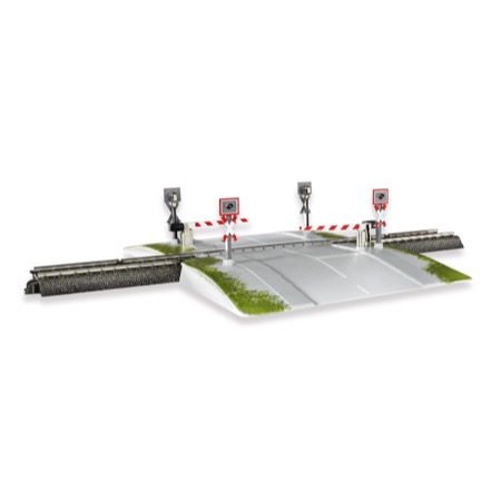 The railroad grade crossing comes with half gates. This grade crossing can be connected directly to C Track. 2 solenoid activated gates with 2 red warning lights, which come on when the gates come down. This grade crossing is ready to be connected to the layout, easy installation. Contact track set: 3 straight tracks each 94.2 mm / 3-3/4". Dimensions for each base half 137 x 95 mm / 5-3/8" x 3-3/4".