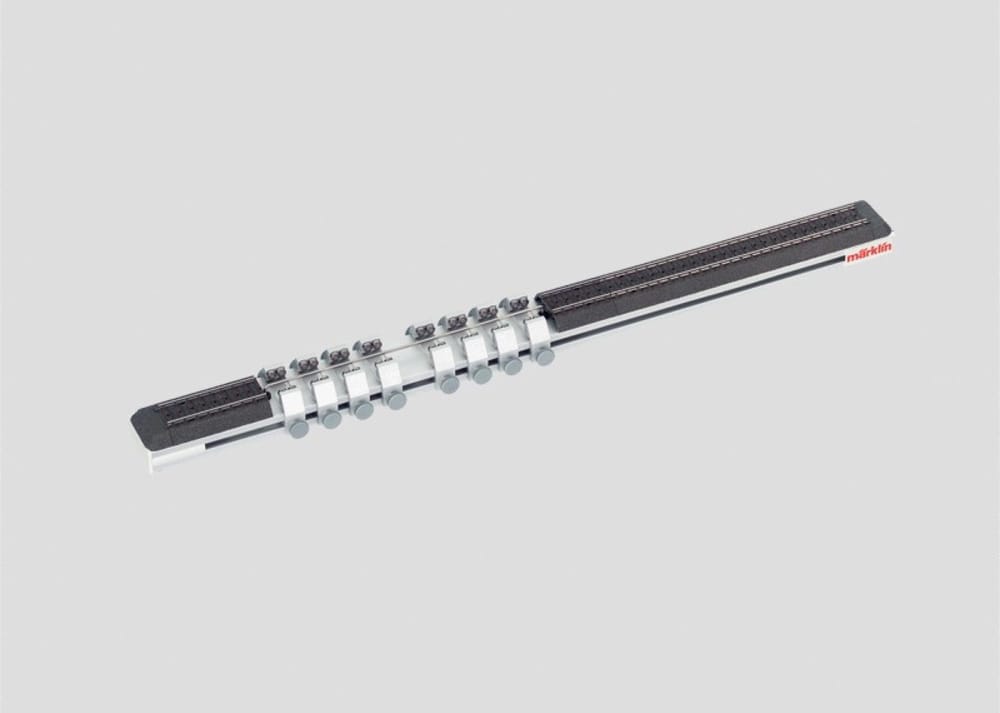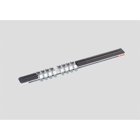 This is for servicing and presenting locomotives with up to 8 driving axles and coupled axles. It is also suitable for the "Big Boy". Eight adjustable pairs of roller brackets with precision ball bearings are included. The design and technical construction are the same as 78100. The 78111 measurement device can be added to this roller test stand. Dimensions 520 x 42 x 30 mm / 20-1/2" x 1-5/8" x 1-3/16".