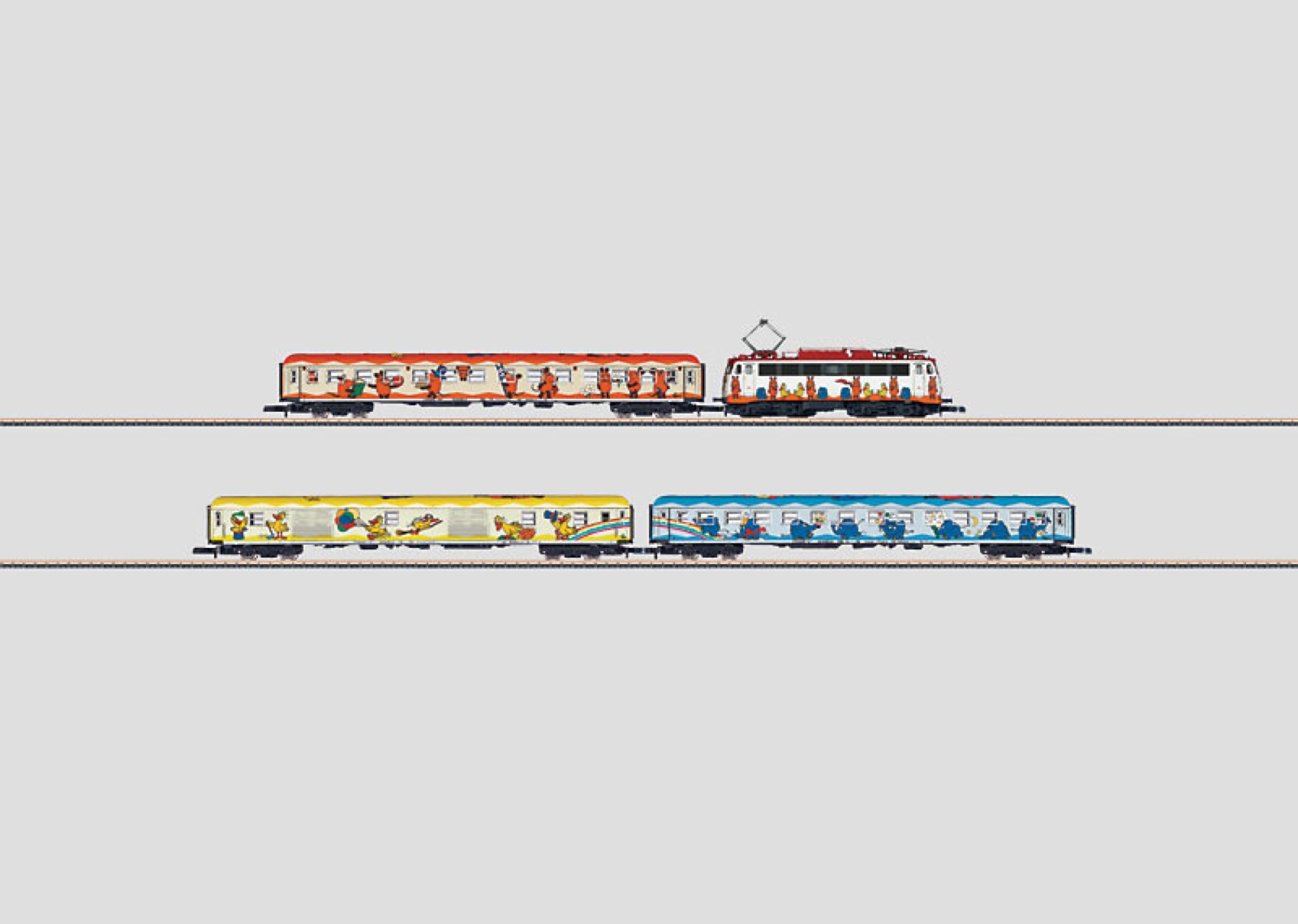 The locomotive is the version with Klatte vents, windows with rounded corners, without buffer streamlining, and without skirting. The locomotive has a 5-pole motor, and the LED headlights change over with the direction of travel. Both trucks are powered. The locomotive and cars have dark wheel treads. The locomotive and cars are in a special edition and are not available separately. Length over the buffers 436 mm / 17-3/16".