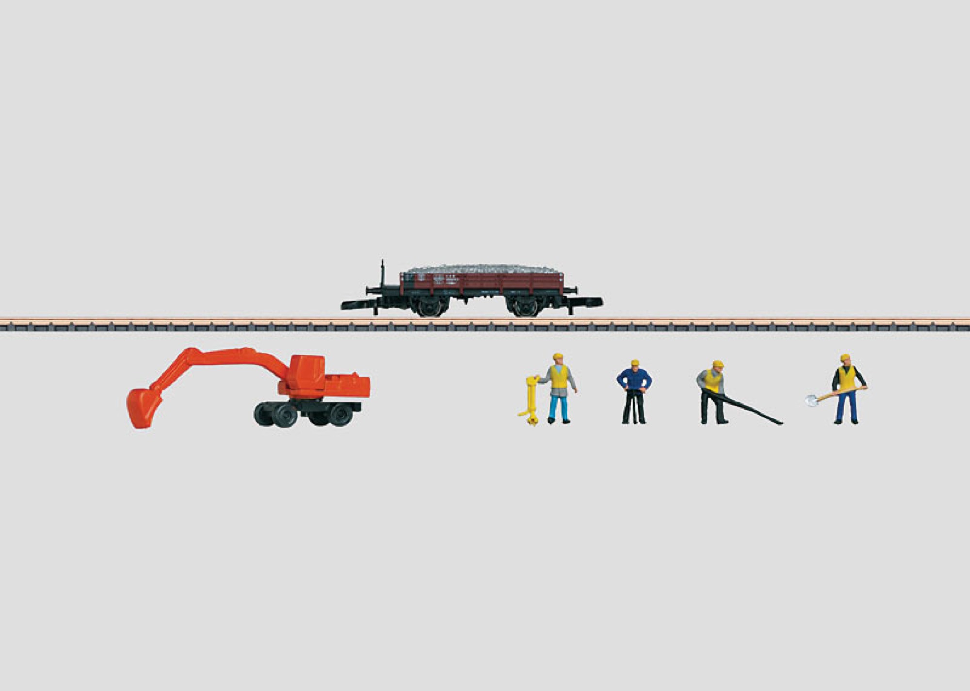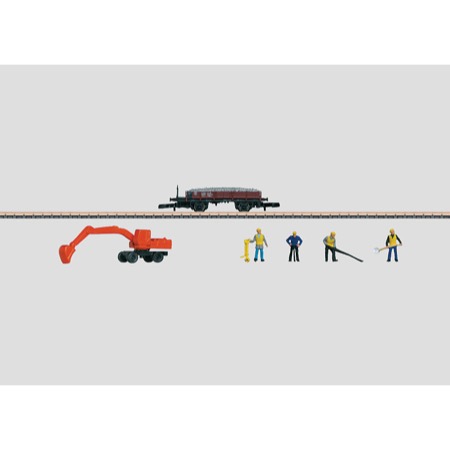 The railroad maintenance car set consists of a finely detailed low side car loaded with a load insert of track ballast. The power shovel is constructed of metal and there are 4 Preiser figures with tools. Length over the buffers 40 mm / 1-9/16”.
