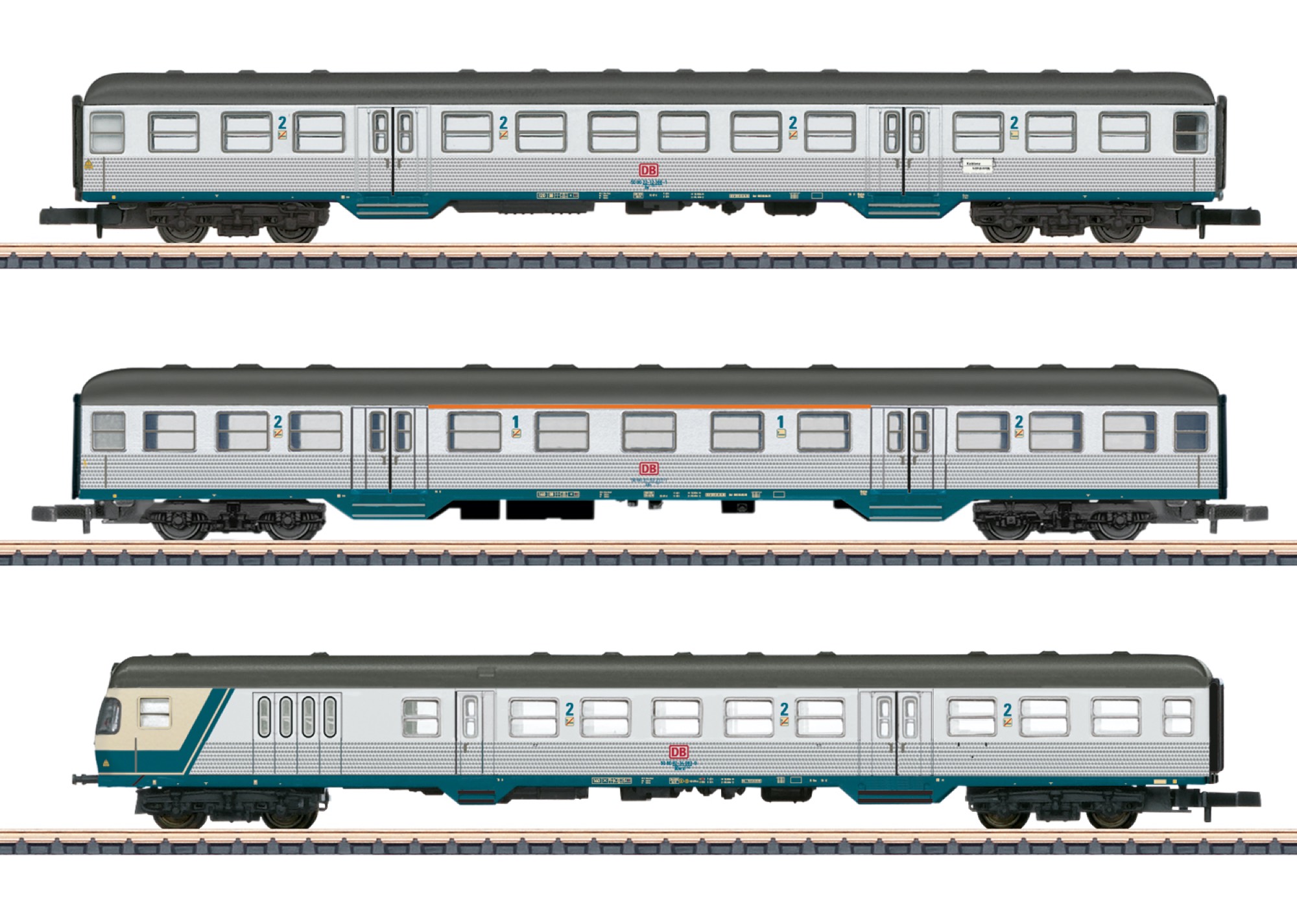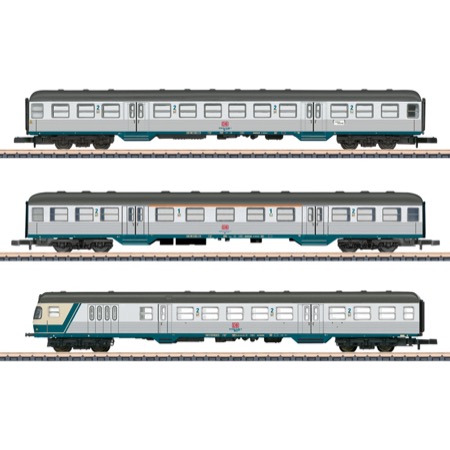 >Prototype: Commuter car, 2nd class (type Bn 719), type ABn 703 commuter car 1st/2nd class, and type BDnrzf 740 commuter cab control car (car number: 50 80 82-34 083-9, preserved in the DB Museum in Koblenz) of the German Railroad, Inc.