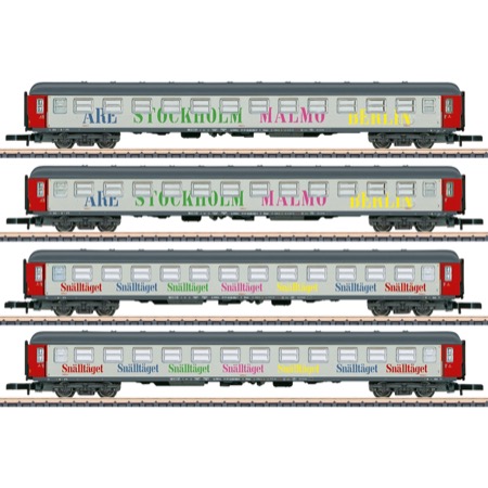 >Prototype: Four Swedish type Bmpz compartment cars (2. class), registered in Austria. Representation of the "Berlin-Malmö Express". Lettered on one side with "Snälltåget" and on the other side with the stations served by the train (Are, Stockholm, Malmö, Berlin). The cars look as they currently do in real life.