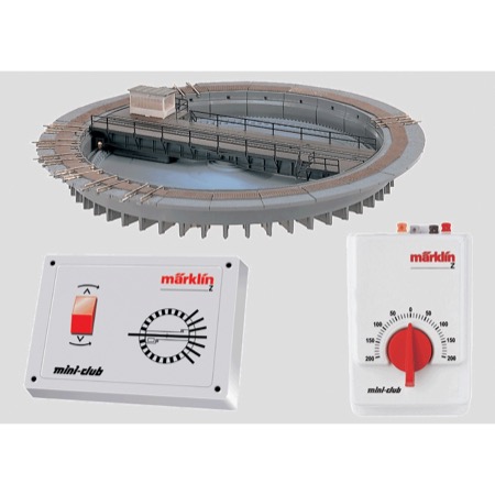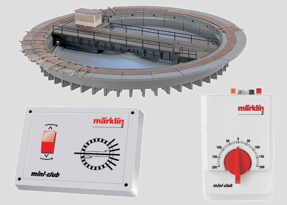 The turntable requires a sunken installation for flush mount on a layout baseboard. It has 8 spoke tracks on the outer edge of the turntable pit. It can be expanded to 24 spoke tracks with the 8997 edge segments that can be snapped onto the turntable pit. The turntable has extensive detailing and prototypical paintwork. It is operated by remote control using a controller included with it. It has a 5-pole electric motor for a drive mechanism. There is automatic shutoff of power to all tracks not lined up and in contact with the turntable deck. A Z power pack is included for a finer feel in operating locomotives onto the turntable and from the turntable to the stall tracks, as well as in the entire railroad maintenance facility area. External turntable diameter 170 mm / 6-11/16". Deck length 132 mm / 5-3/16". The diameter of the opening required for installation on a baseboard is 145 mm / 5-11/16". The turntable can be used with the 8983 locomotive shed. This illustration shows how 2 of the 8983 locomotive sheds can be set up with the 8998 turntable.