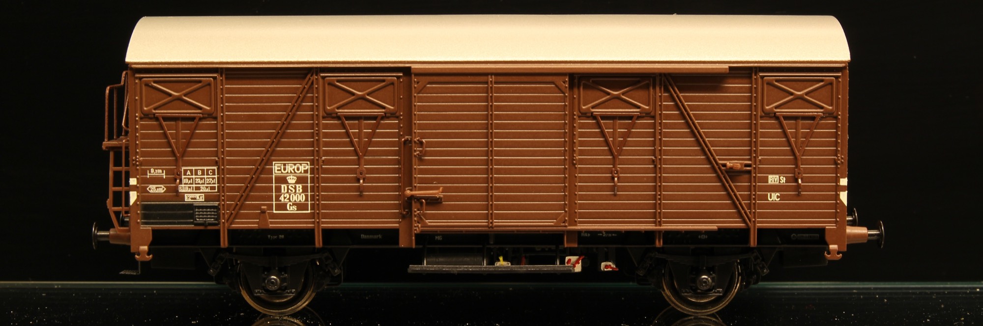 McK 0402: DSB Gs 42000, Serie II, Brun med sølvfarvet tag og EUROP mærke. Periode: 1962-1966 Generelt om modellen: Modellerne består grundlæggende af en støbt metalbund og en vognkasse af plast, og er efterfølgende opbygget af mange løst fremstillede dele i både metal og plast. Vognene har blandt andet fjedrende puffere af messing, ætsede hjørnetrin, håndbøjler af metaltråd og rigt detaljeret bremsesystem. Alle de numre der produceres, er med små trin, og pladegavle. Gs 2-vognene leveres indledningsvis i følgende varianter: Femcifrede numre, brun vognkasse og sølvfarvet tag, med og uden EUROP-mærkning (leveringsudgave)UIC-numre, brun vognkasse og gråt tag DSB-design, sidste udgave, brun vognkasse og brunt tag