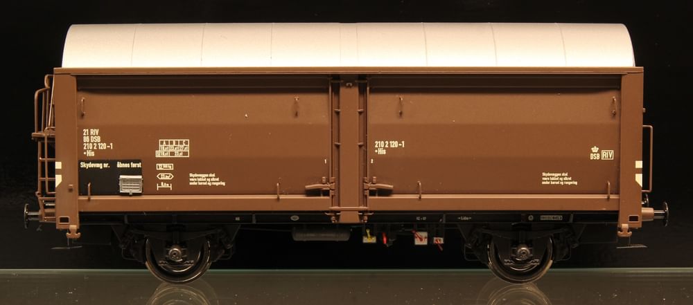 McK 1606: DSB His 21 86 210 2 120-1, Godsvogn, Mørkebrun med sølvfarvet tag og bremseplatform. Periode: 1967-1974 Generelt om modellen: Modellerne består af en støbt metalbund og en vognkasse af plast, og er efterfølgende opbygget af mange løst fremstillede dele i både metal og plast. Vognene har blandt andet fjedrende puffere af messing, ætsede hjørnetrin, håndbøjler af metaltråd og rigt detaljeret bremsesystem.