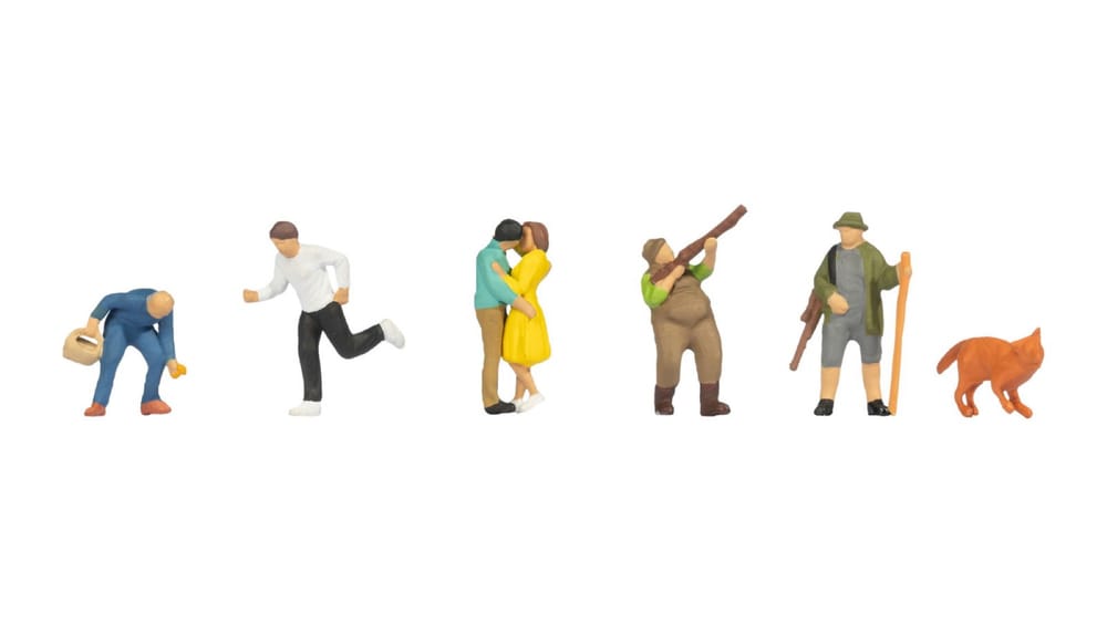 Wie bei NOCH selbstverständlich, sind die Figuren sorgfältig bemalt und detailreich gestaltet, in Deutschland entwickelt und gestaltet. Körperhaltungen, Kleidung und Gestik wirken zurückhaltend und realitätsnah. Nichts ist überzeichnet – alles fügt sich harmonisch in die Szene ein und bildet den Alltag im Wald authentisch ab. Die Einsatzmöglichkeiten sind vielseitig: Auf der Modelleisenbahn bereichern die Figuren Waldstücke entlang der Strecke, abgelegene Haltepunkte oder Übergänge zwischen Natur und Siedlung. Im Modellbau eignen sie sich ideal für Waldlandschaften, ländliche Szenen oder Naturdioramen. Auch für Dekoration und Makrofotografie bieten die Figuren ruhige, stimmungsvolle Motive. In Kombination mit Tieren oder weiteren Figuren-Themenwelten von NOCH entsteht eine lebendige Miniaturwelt, die Natur und echtes Leben glaubwürdig vereint.