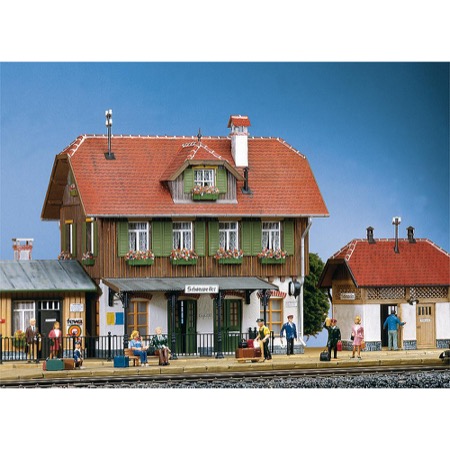 Station with partly covered platform supported by imitation cast iron pillars, platform barrier with opening gate. Two moveable double doors, both onto the street and onto the platform. Window shutters and boxes, decals, etc complete the kit. Attention: In addition, two baseplates (art. 330904) are required!