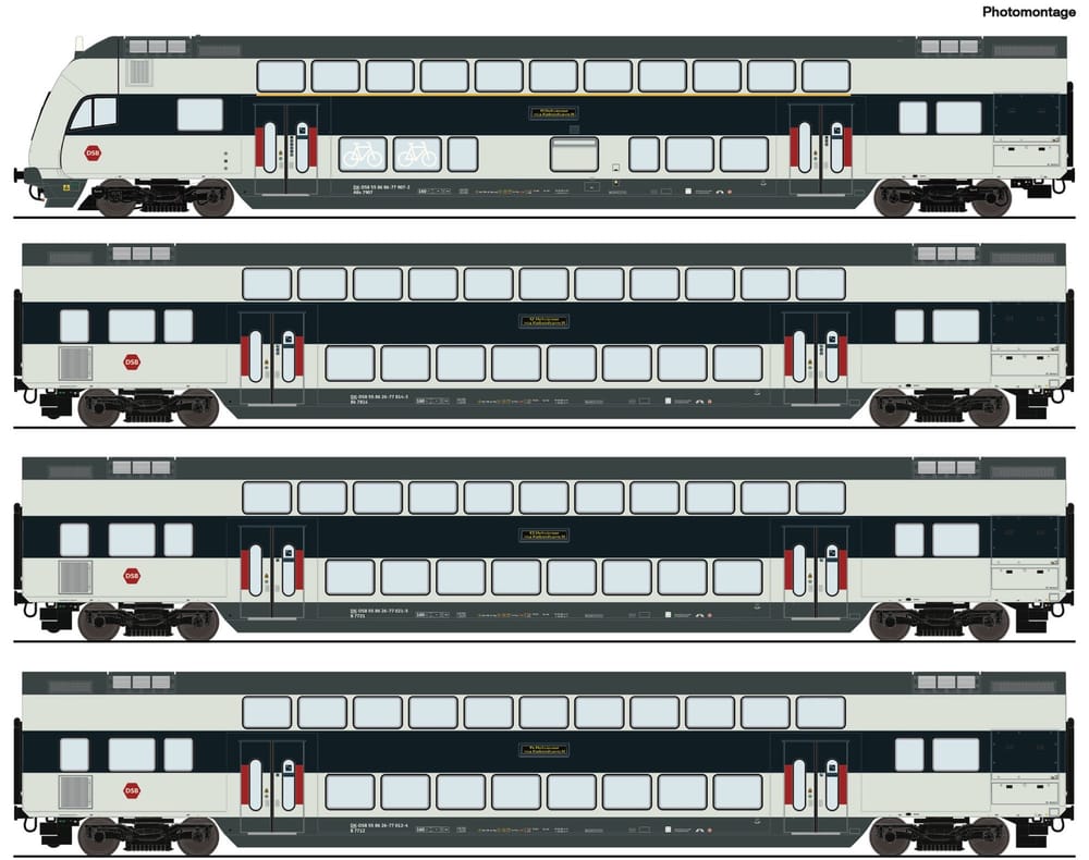 Wagenset mit vier Doppelstockwagen der Dänischen Staatsbahnen.