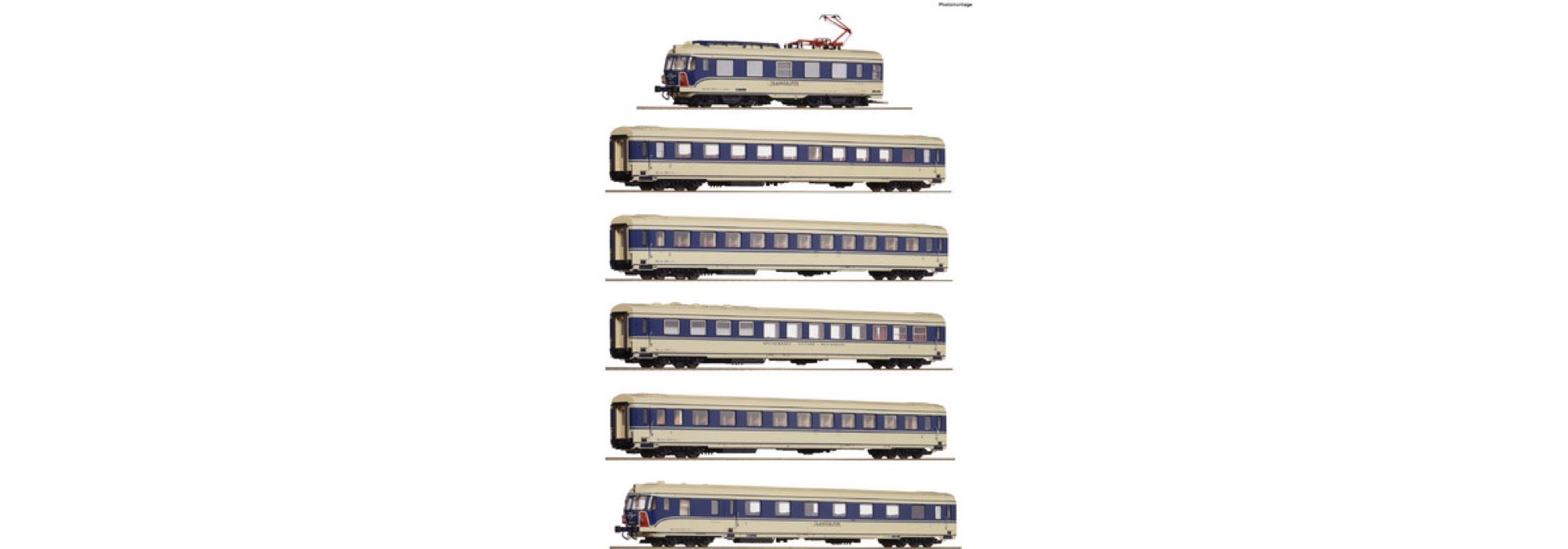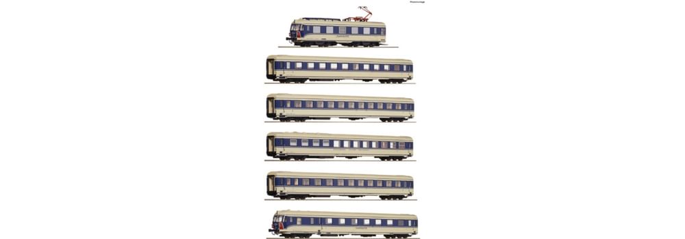 Modell in 6-teiliger Ausführung mit folgender Reihung: Triebkopf, Großraumwagen 2. Klasse, Abteilwagen 2. Klasse, Speisewagen, Abteilwagen 1./2. Klasse, Steuerwagen mit 1. Klasse Großraumabteil.