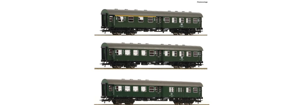 Set bestehend aus drei 4-achsigen Umbauwagen der Deutschen Bundesbahn für einen typischen Nebenbahnzug.