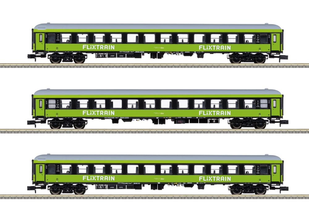 Schnellzugwagen-Set "FlixTrain" Vorbild: 3 Schnellzugwagen 2. Klasse der Bauart Bmmz 264.4F und 264.4. Hellgrüne Grundfarbgebung. Privatwagen der Firma Trainpool GmbH & Co. KG, vermietet an FlixTrain GmbH, München. Betriebszustand um 2020.