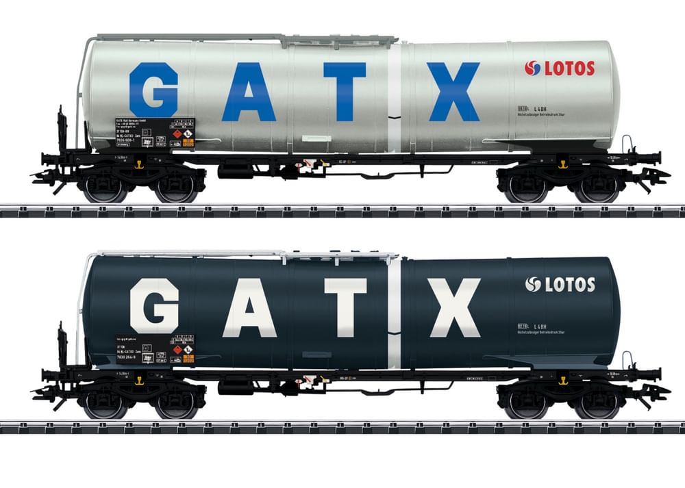 Vorbild: Zwei 4-achsige Kesselwagen der GATX NL in unterschiedlicher Farbgebung. Vermietet an Lotos Polen. Wagen mit unisoliertem Kessel und stirnseitigem Aufstieg. Bauart Zans.
