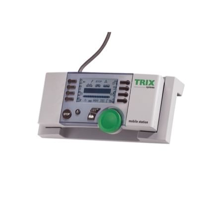 Die Mobile Station von Trix steuert die digitalen Lokomotiven im Direktzugriff über den grünen Drehknopf; die Decoder können dem DCC oder Selectrix-Standard entsprechen. In jeder digitalen Lok lassen sich außer dem Spitzenlicht bis zu acht zusätzliche Funktionen aktivieren; die betreffenden Tasten befinden sich direkt neben dem übersichtlichen Display. Man kann die Mobile Station entweder auf reinen DCC-Betrieb einstellen, dann lassen sich bis zu 9.999 Lokadressen über die numerische Adresswahl auswählen. Oder man wählt den gemischten DCC-/Selectrix-Betrieb, hier lassen sich bis zu 100 Selectrix- und 16 DCC-Lokomotiven ansteuern, die DCC-Loks wurden zuvor aus den 9.999 Adressen ausgewählt. Für den Fahrbetrieb können die Loks aus einer individuell beschreibbaren Datenbank ausgewählt werden, oder, wie früher üblich, direkt über die herkömmliche numerische Digital-Adresse. Für Loks aus der Datenbank kann die Anzeige der Adressen durch eindeutige Bezeichnungen mit bis zu 10 Zeichen ersetzt werden, anstelle von "03" zum Beispiel "E 10 blau", "BIGBOY" oder "ICE 3". Die Datenbank umfasst einen Speicher von bis zu 40 Namen. Den Funktionen dieser Loks lassen sich eindeutige Symbole zuordnen. Selbstverständlich können Sie alle anderen Loks weiterhin über ihre numerischen Adressen mitsamt ihren Funktionen aufrufen. Der Arbeitsspeicher der Mobile Station erlaubt es bis zu 16 Lokomotiven im DCC-Format und gleichzeitig 100 Lokomotiven im SX-Format aktiv zu halten. Dazu zählen auch stehende Loks, deren Beleuchtung aktiv ist. Neugekaufte Digital-Loks können sehr komfortabel in Betrieb genommen werden: Auf dem Programmiergleis informiert sich die Mobile Station über relevante Decoder-Informationen und zeigt dann im Display die Lok-Adresse an. Zusätzlich informiert sie darüber, ob es sich um eine DCC-Lok mit kurzer oder langer Adresse, oder um eine Lok mit Selectrix 1- oder Selectrix 2-Adresse handelt. Auf Knopfdruck lässt sich die Maschine dann direkt in die Lokliste der Mobile Station übernehmen. Die Leistung am Gleis beträgt 1,9 A, damit können bis zu 4 H0-Lokomotiven gleichzeitig fahren, in der Spur N natürlich noch ein paar mehr. Das Anschlusskabel ist fix an der Mobile Station angebracht und besitzt am anderen Ende einen Spezialstecker zum Anschluss an die spezielle Trix Systems-Anschlussbox. Die Abmessungen der Mobile Station betragen 165 x 69 x 35 mm.