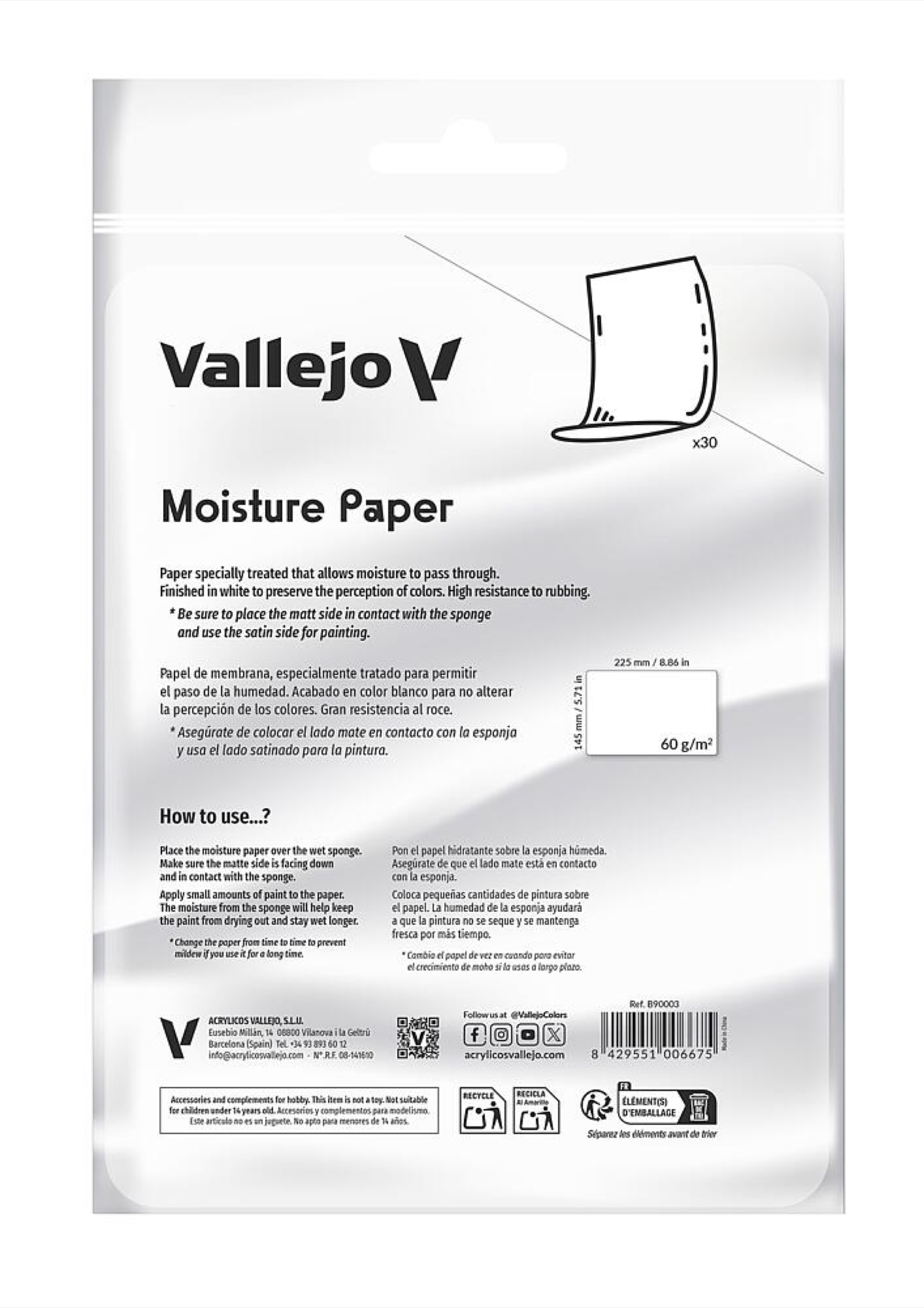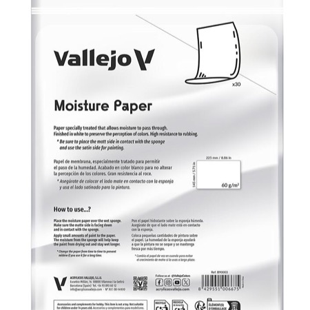 Nachfüllpack für Artikel 709001. 30 x Feuchtigkeitspapier, 225 x 145 mm. Feuchtigkeitsbeständiges Membranpapier. Es ist dünn genug für die Feuchtigkeitsübertragung, aber robust genug, um dem Farbauftrag und der Handhabung beim Farbmischen standzuhalten. In Weiß gehalten, um die Farbwahrnehmung nicht zu verändern. Achten Sie darauf, dass die matte Seite auf dem Schwamm liegt und die satinierte Seite oben.