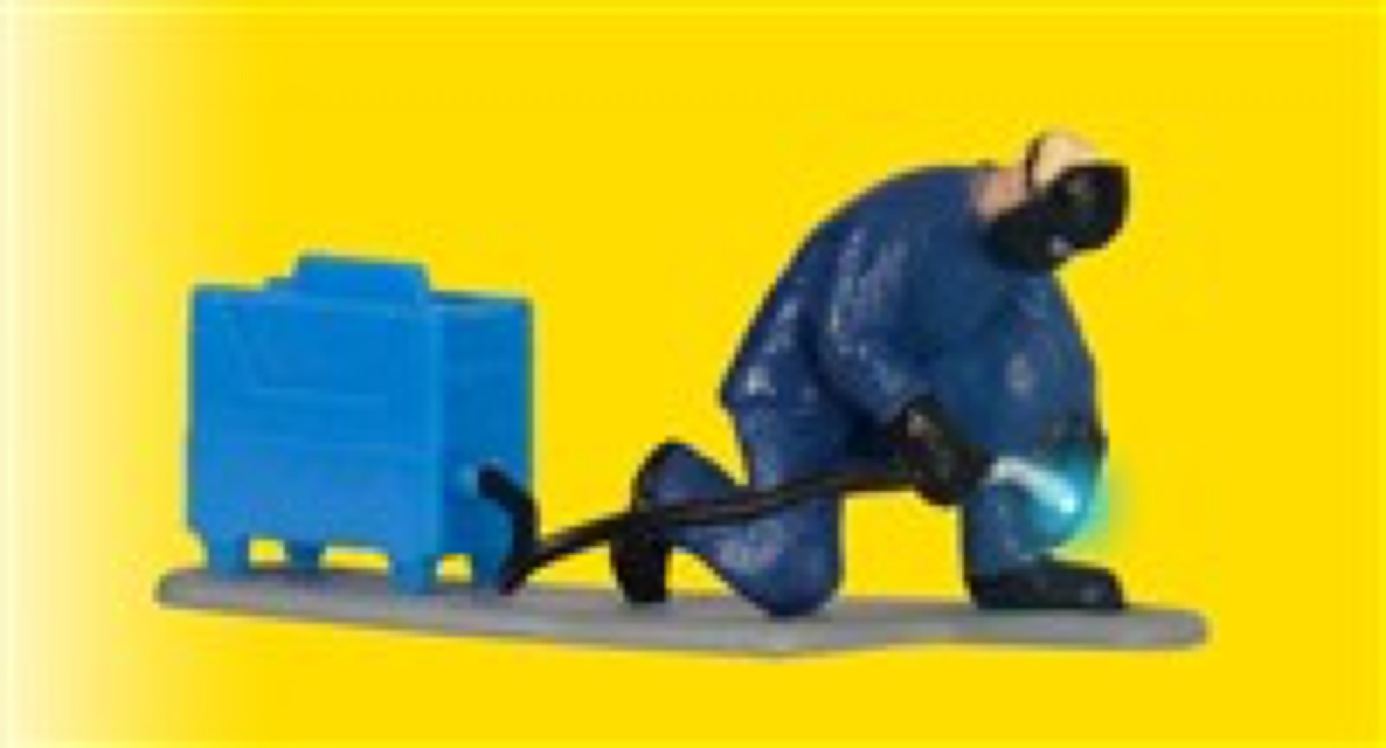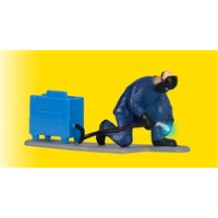 Der Schweißer kniet und verrichtet seine Arbeit in entsprechender Schutzkleidung. In unregelmäßigen Abständen blitzt durch eine Mikro-LED simuliertes Schweißlicht auf und sorgt für einen realistischen Effekt. Einbautiefe: 38 mm. Passt perfekt zur Hebebühne Art. 5131 und kibri Art. 38541 ARAL Tankstelle.