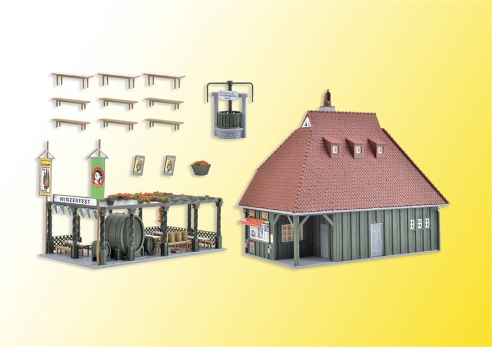 Lassen Sie sich von der weinseligen Stimmung und der urigen Gemütlichkeit anstecken. Der Bausatz ist mit vielen stimmungsvollen Details ausgestattet, z. B. einer historischen Weinkelter und einer Außenterrasse mit Weinfässern und Bänken. Maße: L 14,2 x B 16 x H 13 cm.
