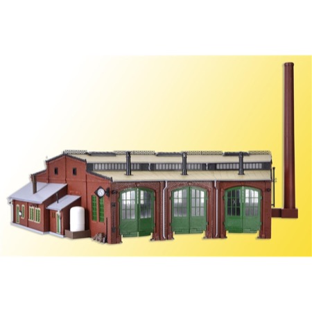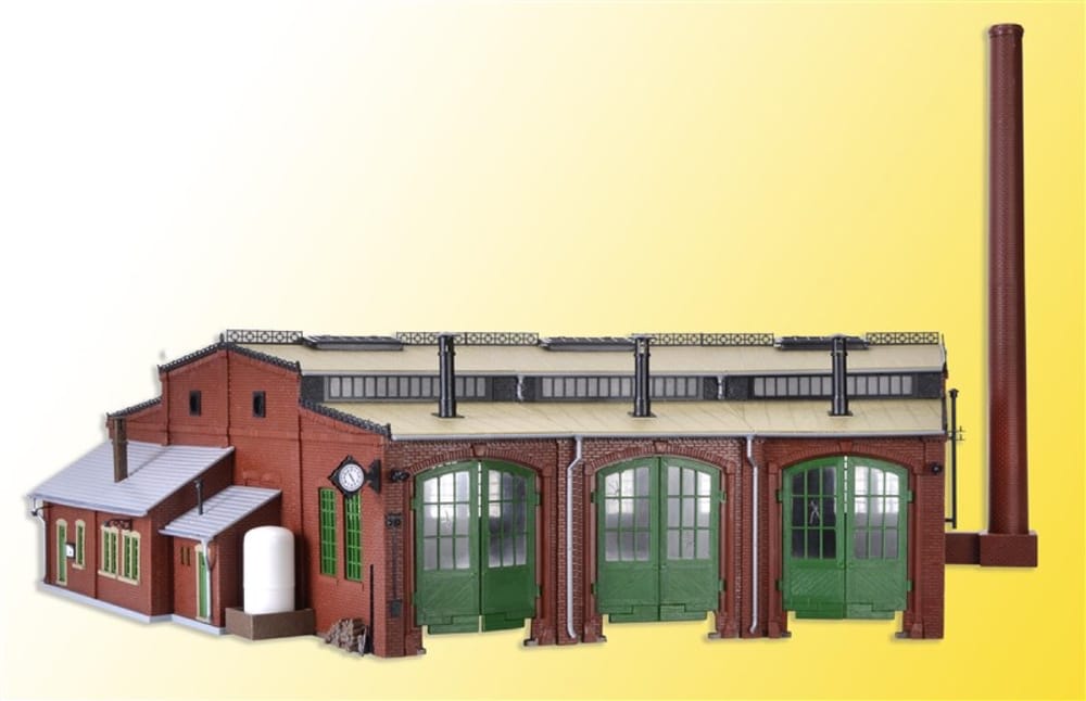 Dieser Ringlokschuppen mit Schornstein ist eine Nachbildung vom Bw Horb/N. Er ist mit zahlreichen charakteristischen Details ausgestattet. Die Türen werden von ein- und ausfahrenden Loks geschlossen und geöffnet. Er ist für alle Modellbahnen in Spur H0 verwendbar. Im Ringlokschuppen können Lokomotiven bis 280 mm Länge untergebracht werden. Die Drehscheiben von Fleischmann, Art. 6152 und Märklin, Art. 7286/7686 für 15°-Teilung können mit diesem Ringlokschuppen verwendet werden. Dazu ist zwischen den Abstellgleisen eine Abdeckplatte zu belassen. Ohne Drehscheibe können Sie folgende Gleise einsetzen 15°-Fleischmann Art. 6052/6154, 9°-Roco Art. 42615 (9°+6°=15°). Maße: L 49 x B 33 x H 13 cm / Kamin H 30 cm / Radius 585 mm / Winkel der Lokstände 15°.